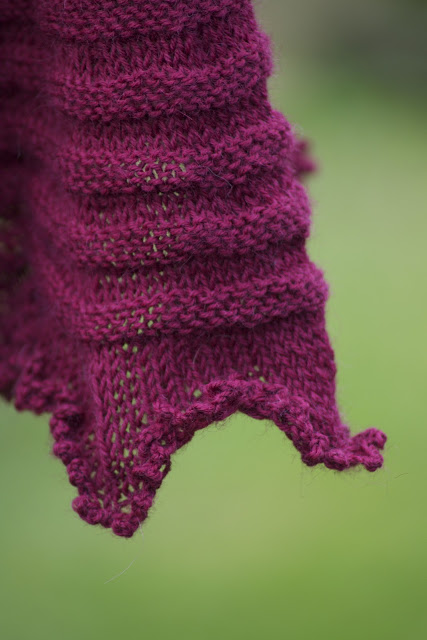 I chose Plum for my Ammonite, because I felt that considering the existing colour scheme of my everyday wardrobe (black, white, grey and navy), I was able to dress - up existing outfits with a shawl in a strong, expressive colour that would stand out. I purposefully, decided against using variegated or tonal yarn. As I have recently been contacted by a fellow Raveler in respect of the use of tonal yarn for Ammonite, I think it is necessary to mention this point. I am pretty much a sock yarn novice and have never used variegated yarn in any of my projects thus far. In fact, I am not sure whether I like it that much. It might be suitable for sock patterns. Certain shawl patterns - Wingspan comes to mind - really benefit from the use of variegated yarn, but, personally, I prefer and tend to opt for plain colours in most of my knitting projects. As for Ammonite, I would always advocate the use of a plain colour or only a very slight tonal change in the colour, as intensely variegated yarn might have an adverse effect on showcasing the pattern and the structure of the garment. Having said that, I would be intrigued to see an Ammonite in tonal yarn and I am very tempted myself to knit up a small swatch with some picot edging just to see whether it works. If the swatch turns out well, the design might work in variegated yarn, too. It's worth a little experiment, I think.